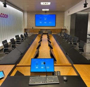 Legacoop disponeva già di una sala con alcune dotazioni di base ma negli ultimi mesi è nata l’esigenza di un ambiente dove disporre di una collaborazione più fluida ed efficace, sia per i partecipanti in presenza sia per quelli collegati da remoto. La sala, con un tavolo centrale per circa 25 persone, richiedeva un sistema in cui ogni relatore potesse utilizzare una postazione dedicata, che consentisse la gestione semplice degli interventi e un’esperienza visiva coerente per tutti.
